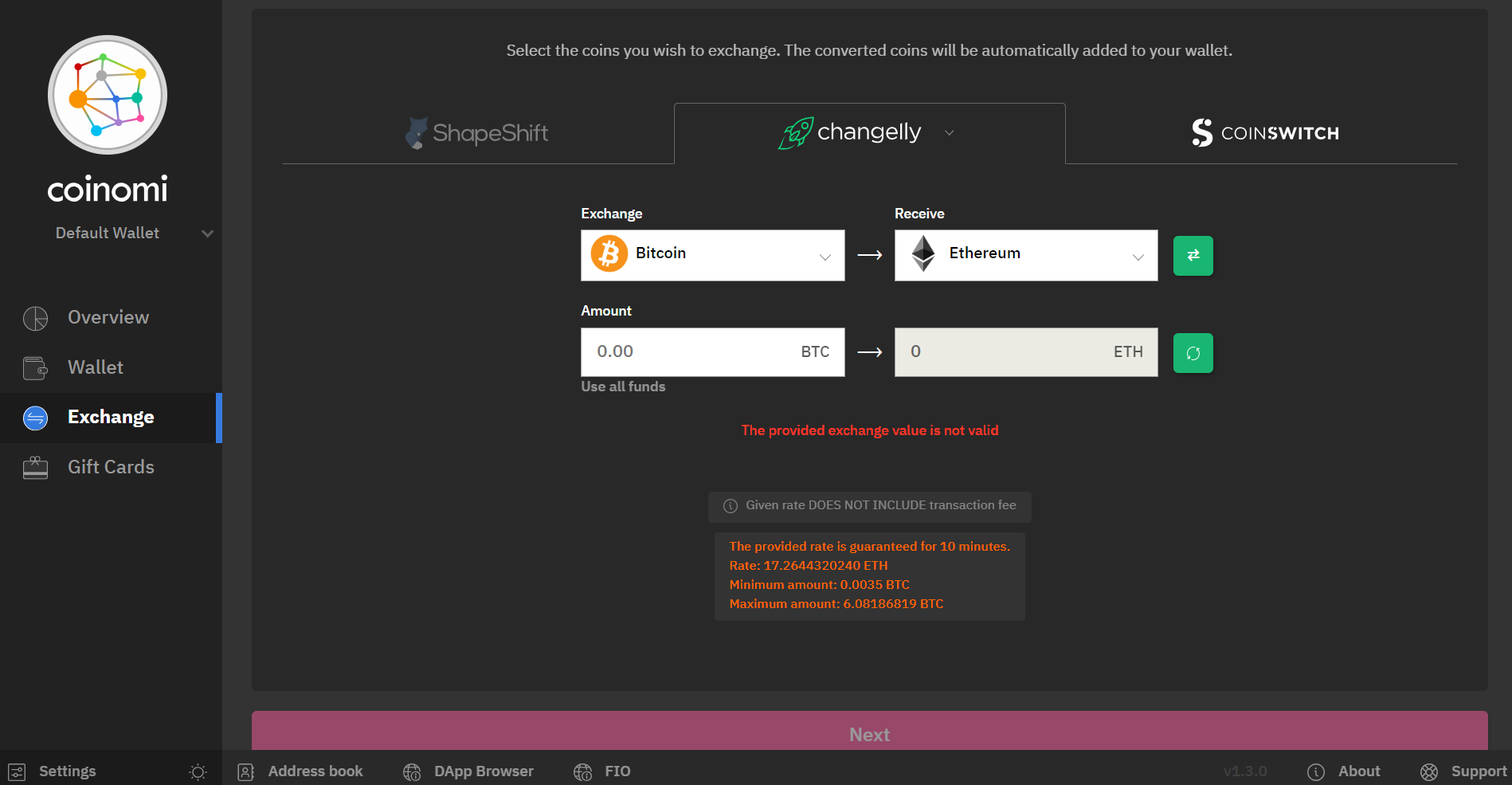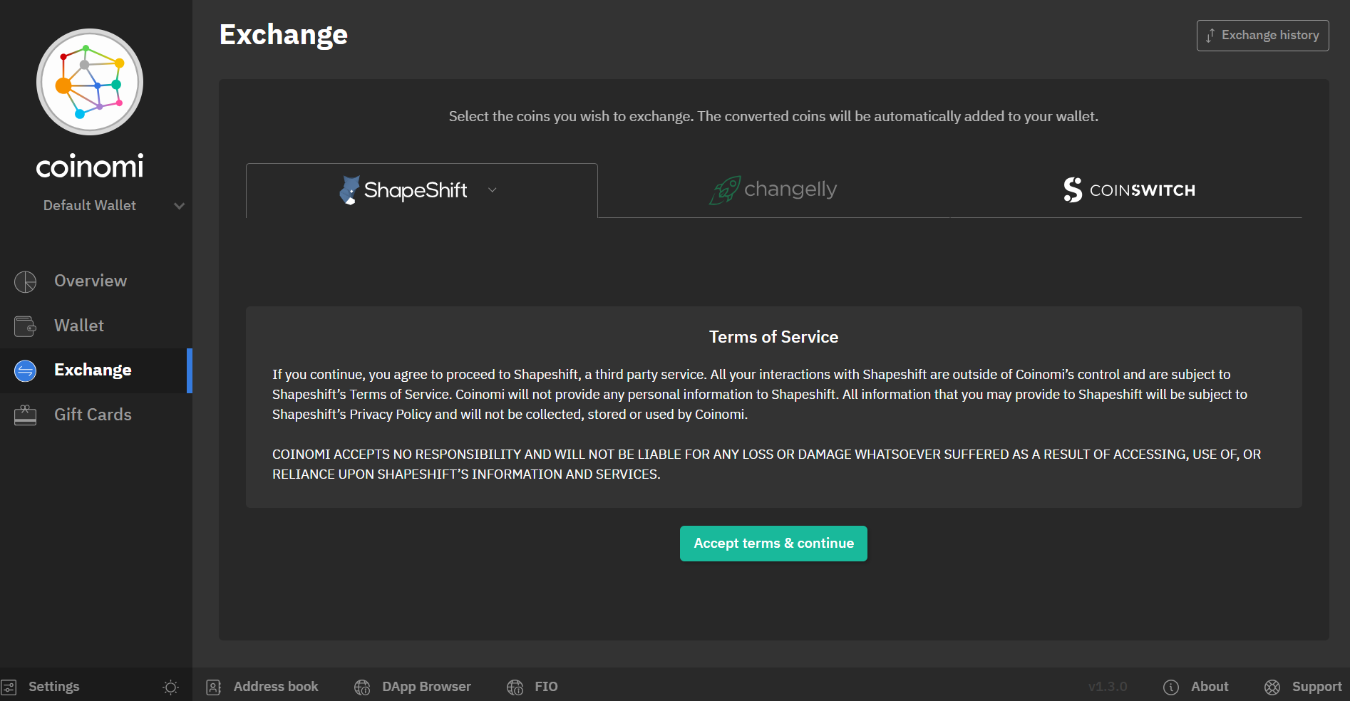از طریق گزینه «Exchange» در پنل کیف پول، میتوانید ارزهای دیجیتال خود را با استفاده از صرافیهای شخص ثالث مانند Changelly و CoinSwitch مبادله کنید.