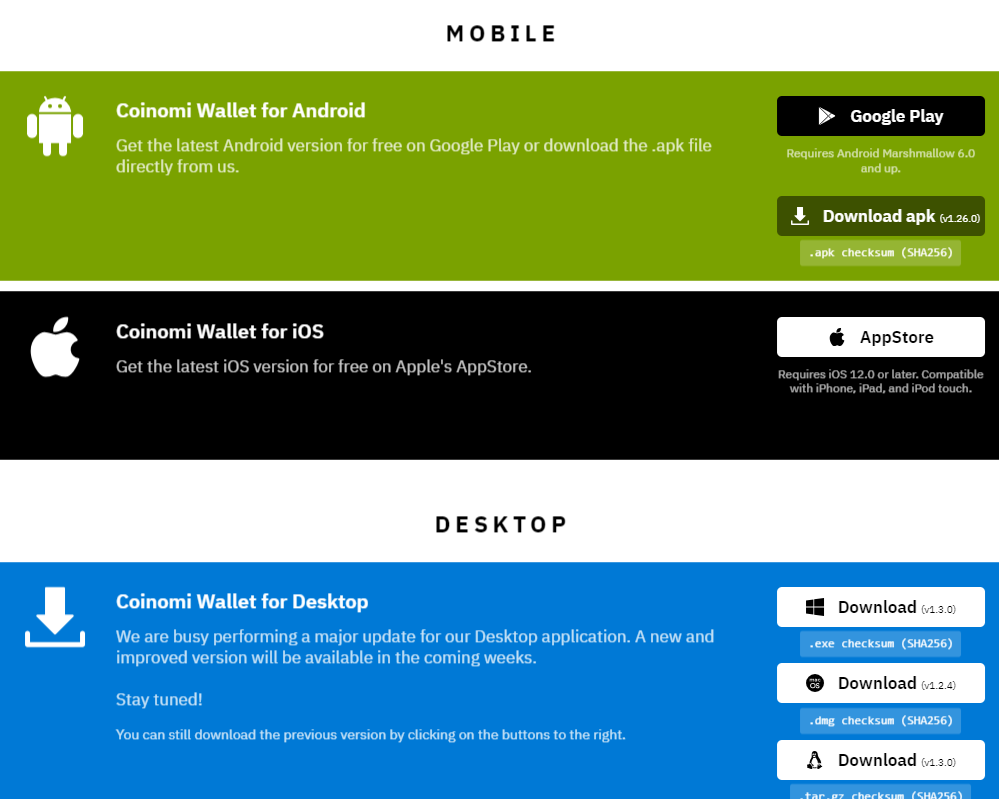 نرمافزار کوینومی در ابتدا بهصورت متنباز (open source) عرضه شد، اما در حال حاضر به یک نرمافزار متن بسته تبدیل شده است. این کیف پول برای همه دستگاهها، شامل موبایلهای اندروید و iOS و همچنین دسکتاپهای ویندوز، مک و لینوکس، نسخه دانلودی ارائه میکند و به کاربران امکان مدیریت داراییهایشان از هر دستگاهی را میدهد.