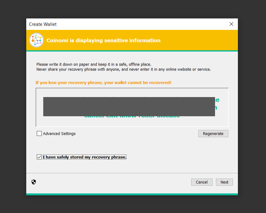 در این مرحله، کوینومی یک عبارت بازیابی ۲۴ کلمهای به شما ارائه میدهد. این عبارت بسیار مهم است و باید آنرا به صورت امن ذخیره کنید. به یاد داشته باشید که این عبارت، کلید دسترسی به داراییهای شماست و در صورت گمکردن آن، امکان بازیابی کیف پول را نخواهید داشت. تیک «I have safely stored my recovery phrase» را بزنید و روی «Next» کلیک کنید.