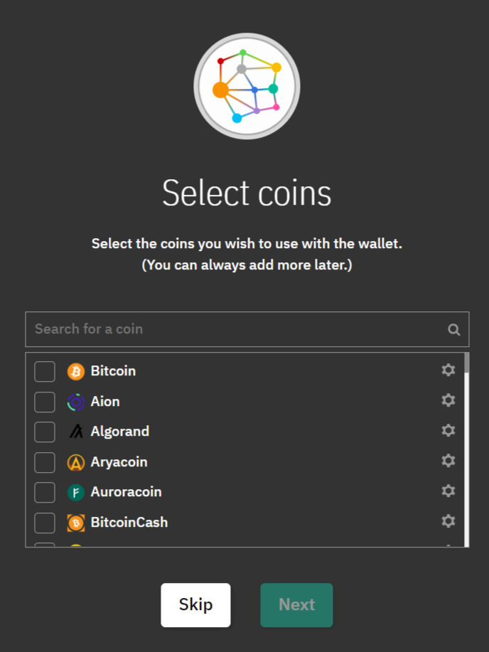 در اینجا میتوانید ارزهای دیجیتالی که قصد استفاده از آنها را دارید، انتخاب کنید. همچنین میتوانید روی «Skip» کلیک کنید و در آینده ارزهای مورد نظر خود را اضافه کنید.