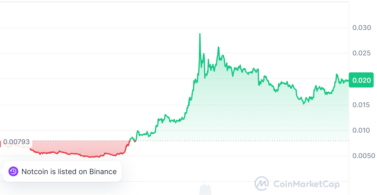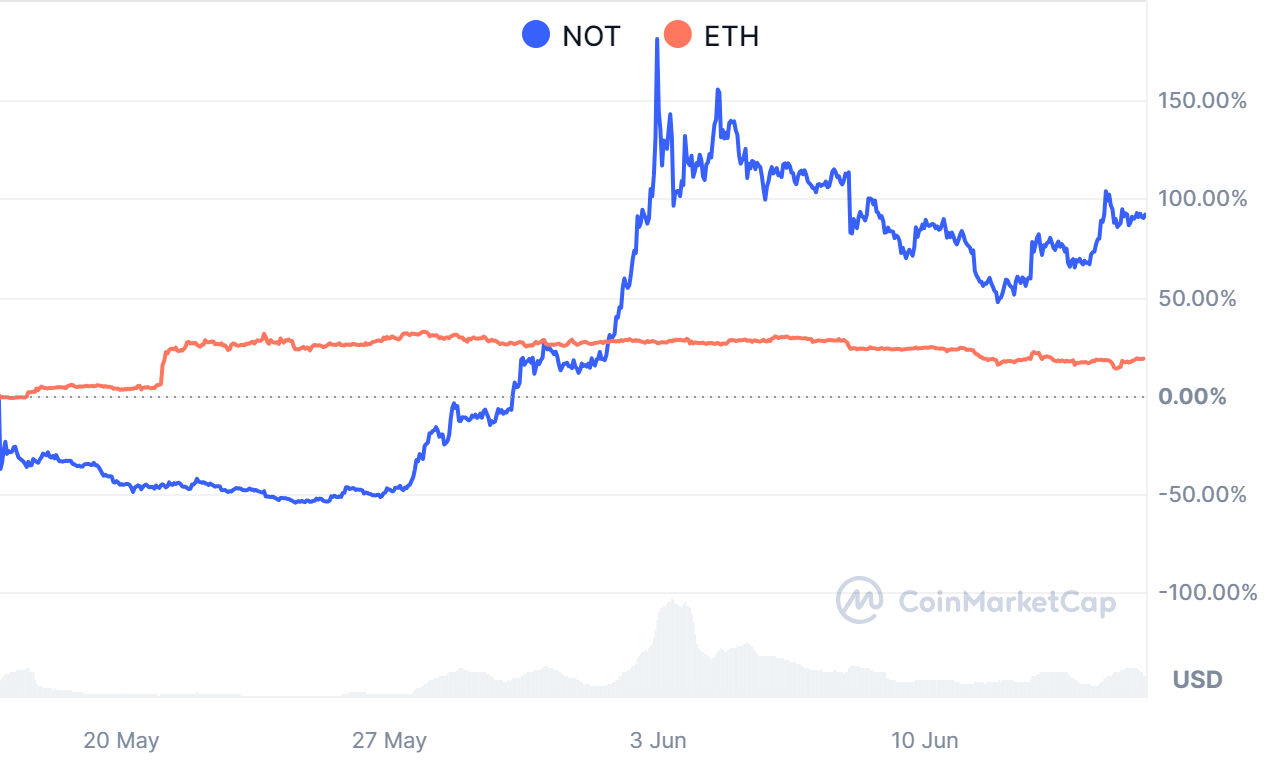 به رغم افت بیت کوین و دیگر ارزهای دیجیتال بزرگ، نات کوین (NOT) توانسته است حرکت صعودی چشمگیری را تجربه کند. در آغاز هفته جاری، به دلیل افزایش ریسکهای اقتصاد کلان و فشار فروش بر بازار ارزهای دیجیتال، نات کوین با کاهش قیمت روبرو شد. اما از زمانی که به کف قیمت موضعی ۰.۰۱۵ دلار در روز سهشنبه رسید، قیمت آن حدود ۴۰ درصد افزایش یافت و تا جمعه به ۰.۲۱ دلار رسید.