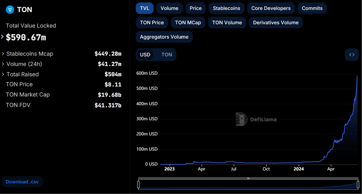 برای مثال، تعداد آدرسهای فعال در شبکه تون به صورت روزانه در این ماه بیشتر از اتریوم بوده است. همچنین، ارزش کل سرمایه قفل شده (TVL) در شبکه تون به ۶۰۰ میلیون دلار رسیده و استخر تتر آن نیز در کمتر از ۲ ماه به بیش از ۴۵۰ میلیون دلار تتر رسیده است.