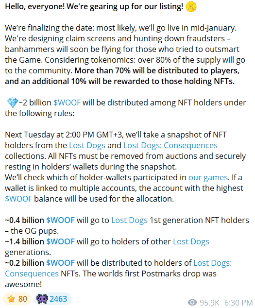 بازی محبوب لاست داگز (Lost Dogs) به تازگی جزئیات مربوط به زمان راه‌اندازی توکن رسمی خود با نماد WOOF را منتشر کرده است. طبق اعلام رسمی، این توکن قرار است اواسط ژانویه (اواخر دی ماه) به صورت رسمی وارد بازار شود.