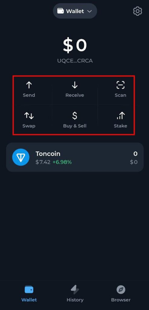 شما اکنون یک کیف پول مبتنی بر شبکه تون کوین دارید که کنترل کامل آن در دستان شماست. در صفحه اصلی کیف پول، گزینههایی برای واریز و برداشت ارز دیجیتال، تبدیل توکنها به یکدیگر (سواپ)، و همچنین خرید مستقیم وجود دارد. در همین صفحه، میتوانید موجودی کیف پول، توکنها و حتی توکنهای غیرمثلی (NFT) مرتبط با آدرس خود را مشاهده کنید.