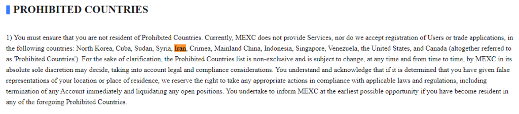 در بخش مقررات مکسی آمده است که این صرافی به کاربران برخی کشورها، از جمله ایران، خدمات ارائه نمی‌دهد. این بدین معناست که حتی اگر کاربران ایرانی توانسته باشند بدون احراز هویت در پلتفرم فعالیت کنند،
